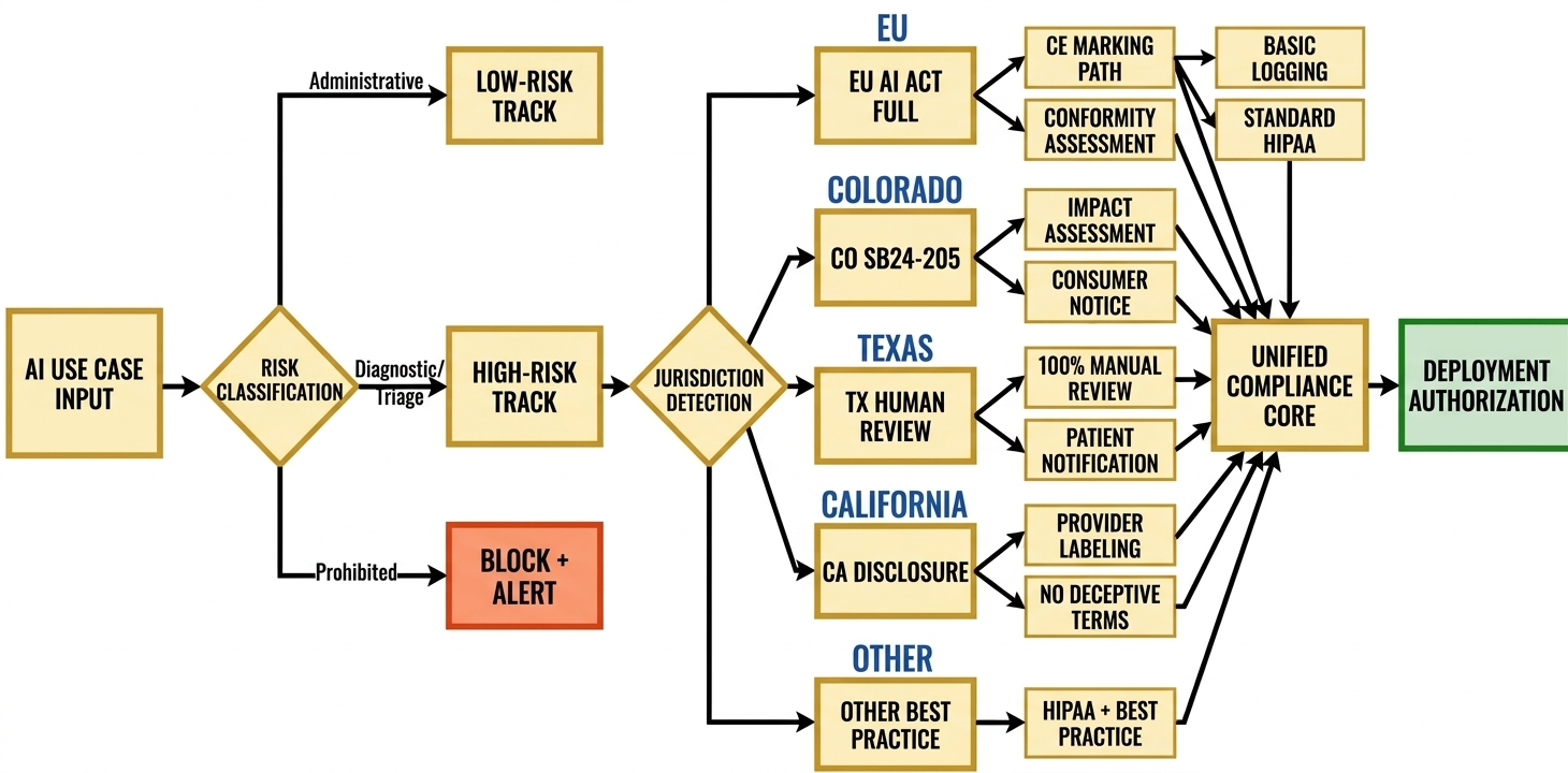- Colorado AI Act (SB24-205): Includes automated impact assessment generation, demographic bias monitoring, and consumer notification workflows for "consequential decisions" in healthcare access.