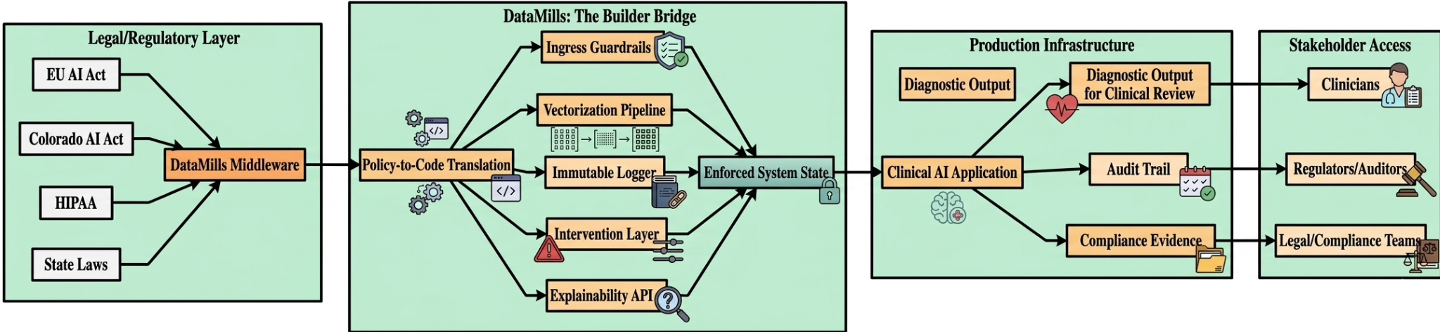 DataMills operates as robust middleware positioned between foundational models and clinical deployment, specifically designed to address stringent regulatory requirements.