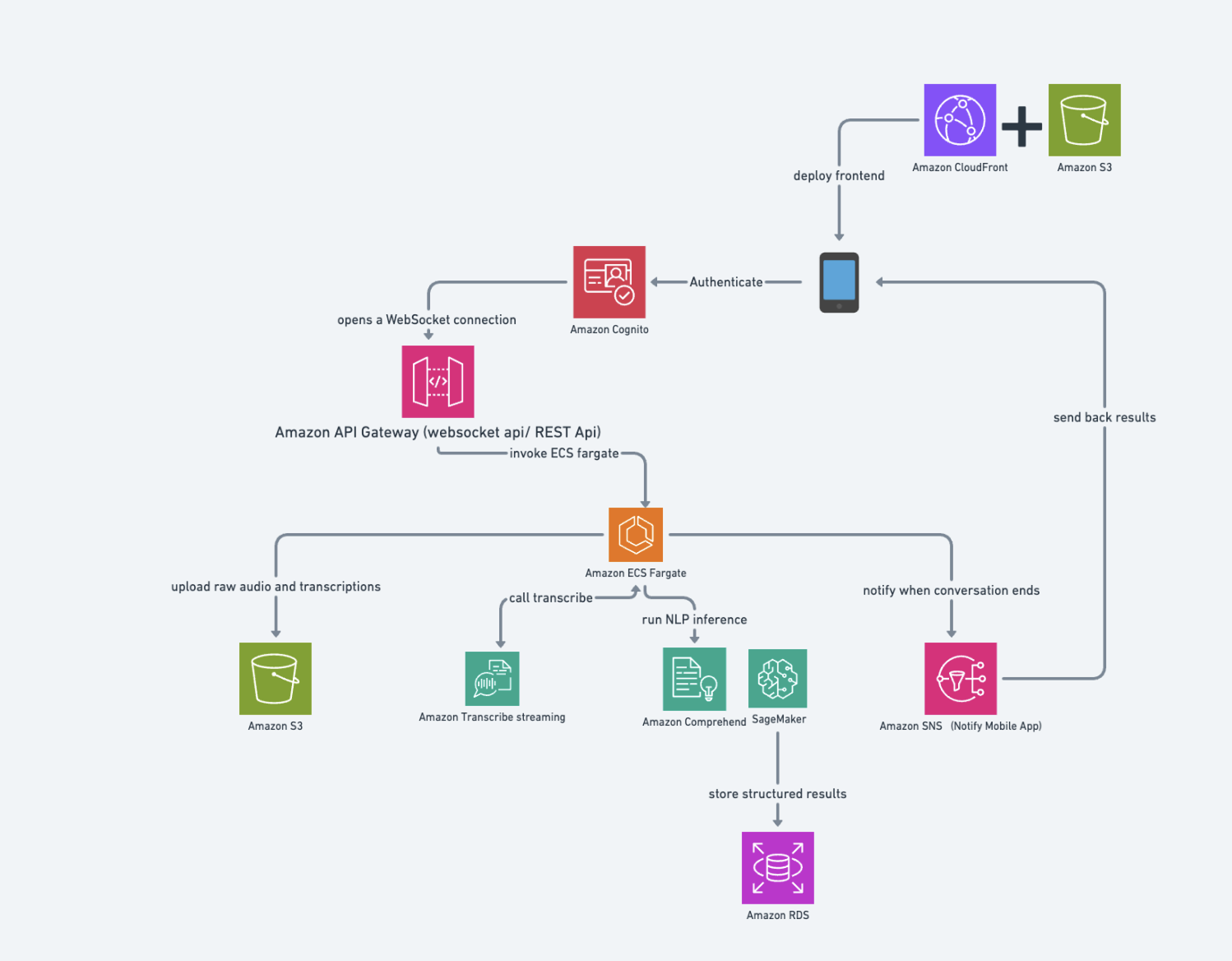 - The system opens a secure WebSocket connection with a frontend (mobile or web) deployed via Amazon CloudFront and S3.