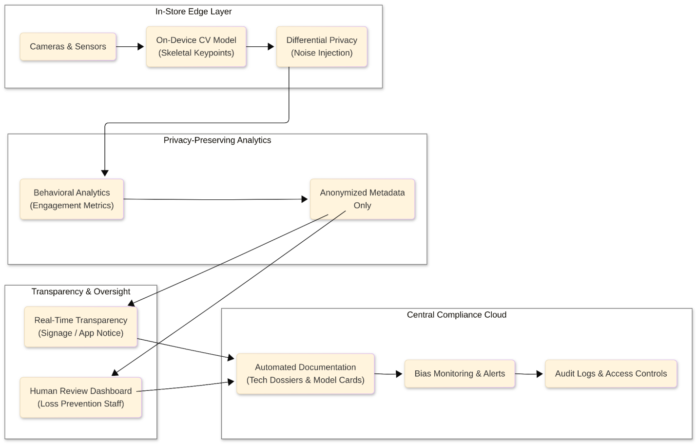 - Differential Privacy: Mathematical noise injection ensures individual shoppers cannot be reidentified from aggregate behavioral data